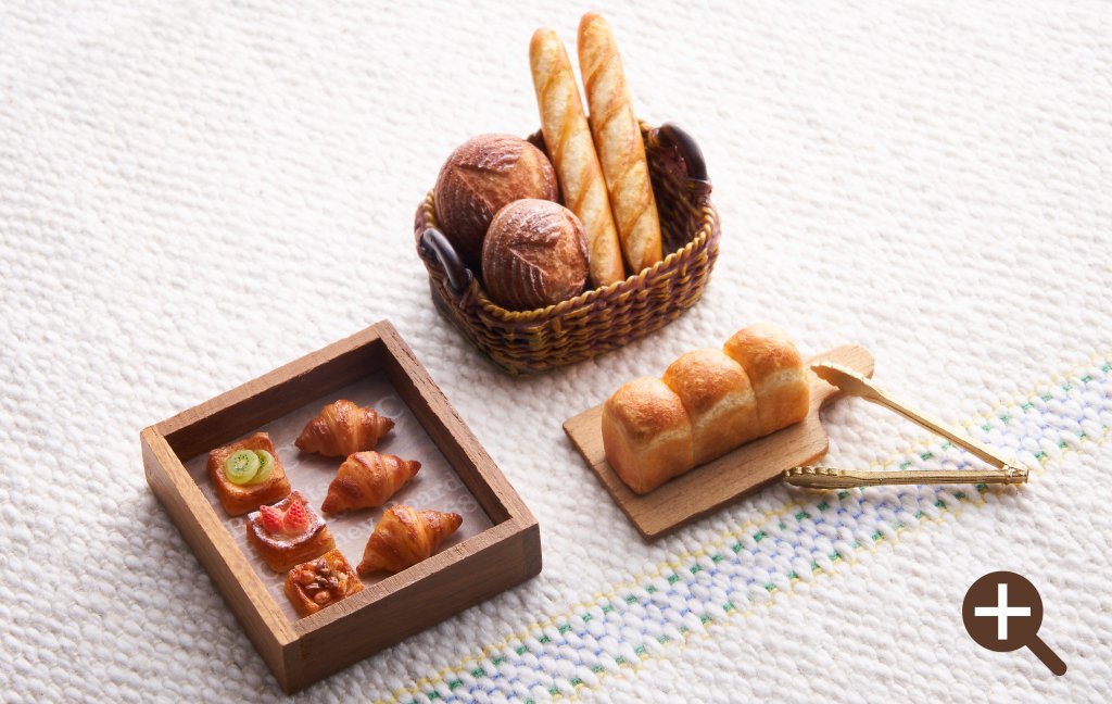 制作する作品は、すべて原寸の1/12サイズで統一。フードや雑貨、家具などを組み合わせて、完成したドールハウスの中に飾って楽しむこともできる。
