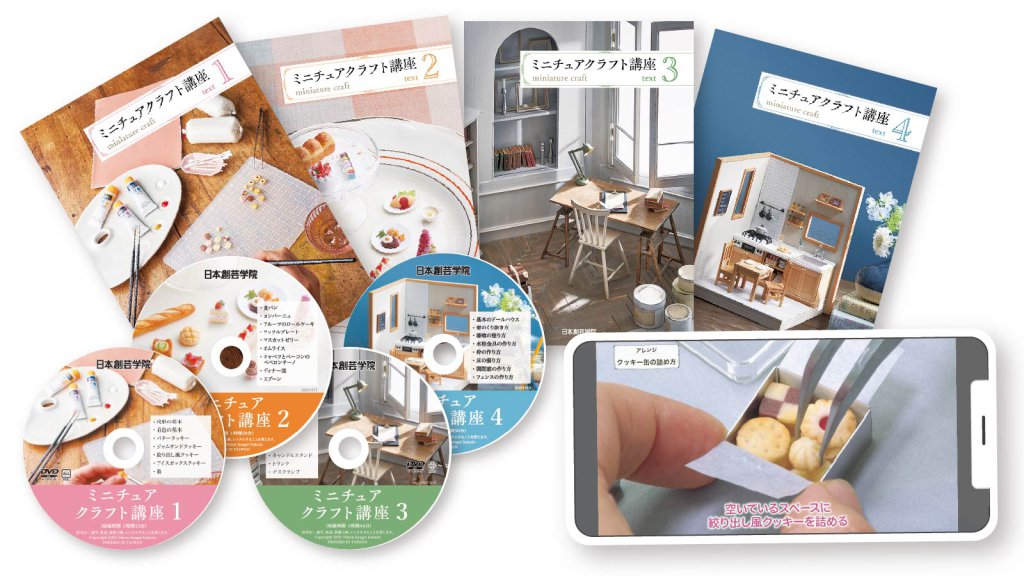 約400頁のフルカラーテキスト4冊に加え、6時間を超える動画で基本からきめ細かく教えてもらえるから、初心者でもわかりやすい。教材どおりに進めていけば、本格的なミニチュアクラフトのノウハウが身につく。
